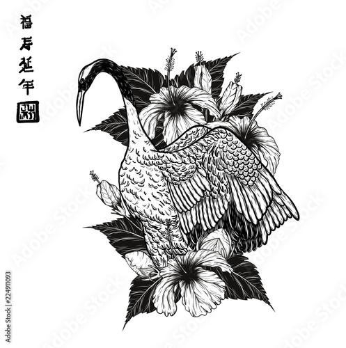 Red Crowned Crane With Hibiscus Tattoo By Hand Drawing Beautiful